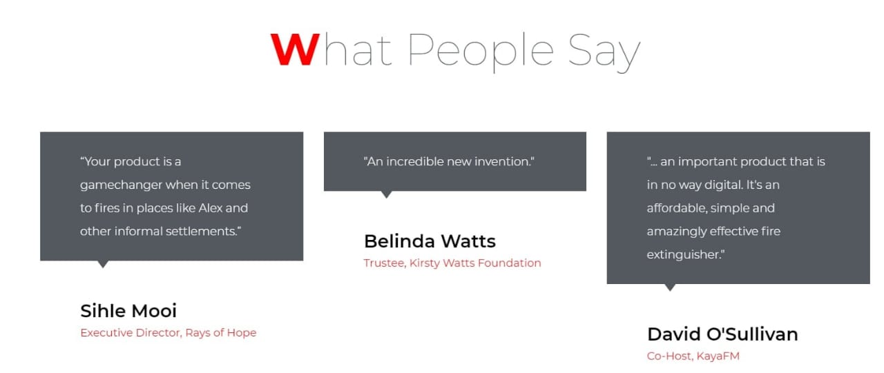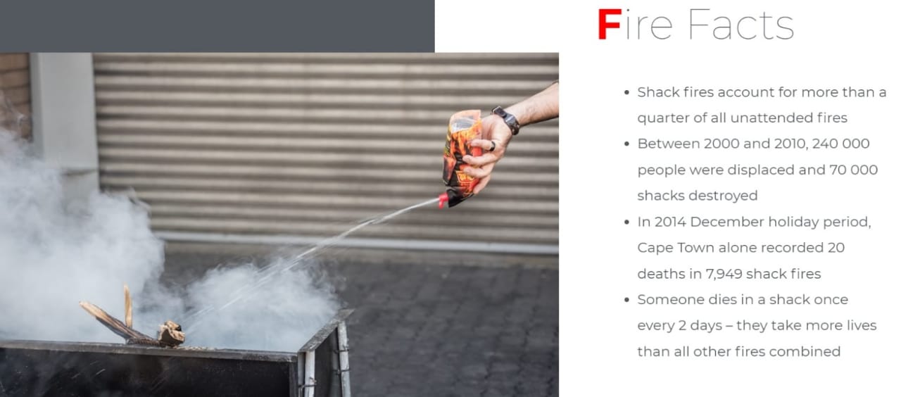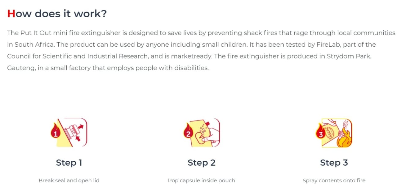 The Put It Out mini fire extinguisher is designed to save lives by preventing shack fires that rage through local communities in South Africa. The product can be used by anyone including small children. It has been tested by FireLab, part of the Council for Scientific and Industrial Research, and is marketready.